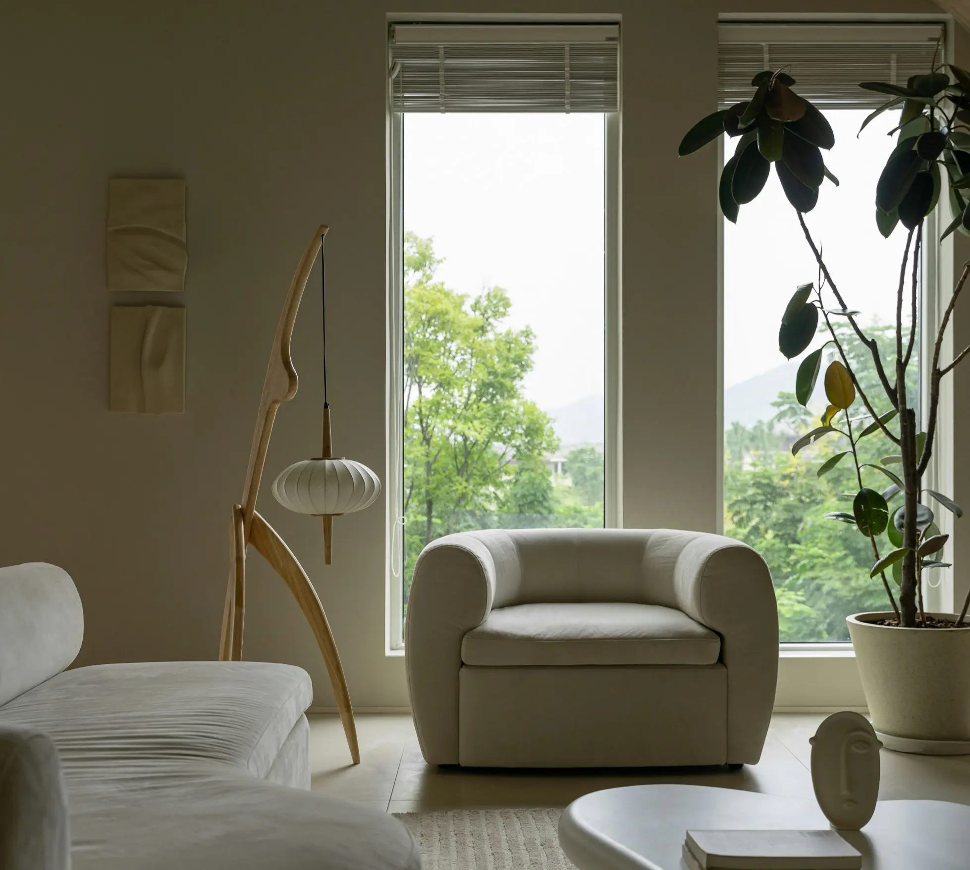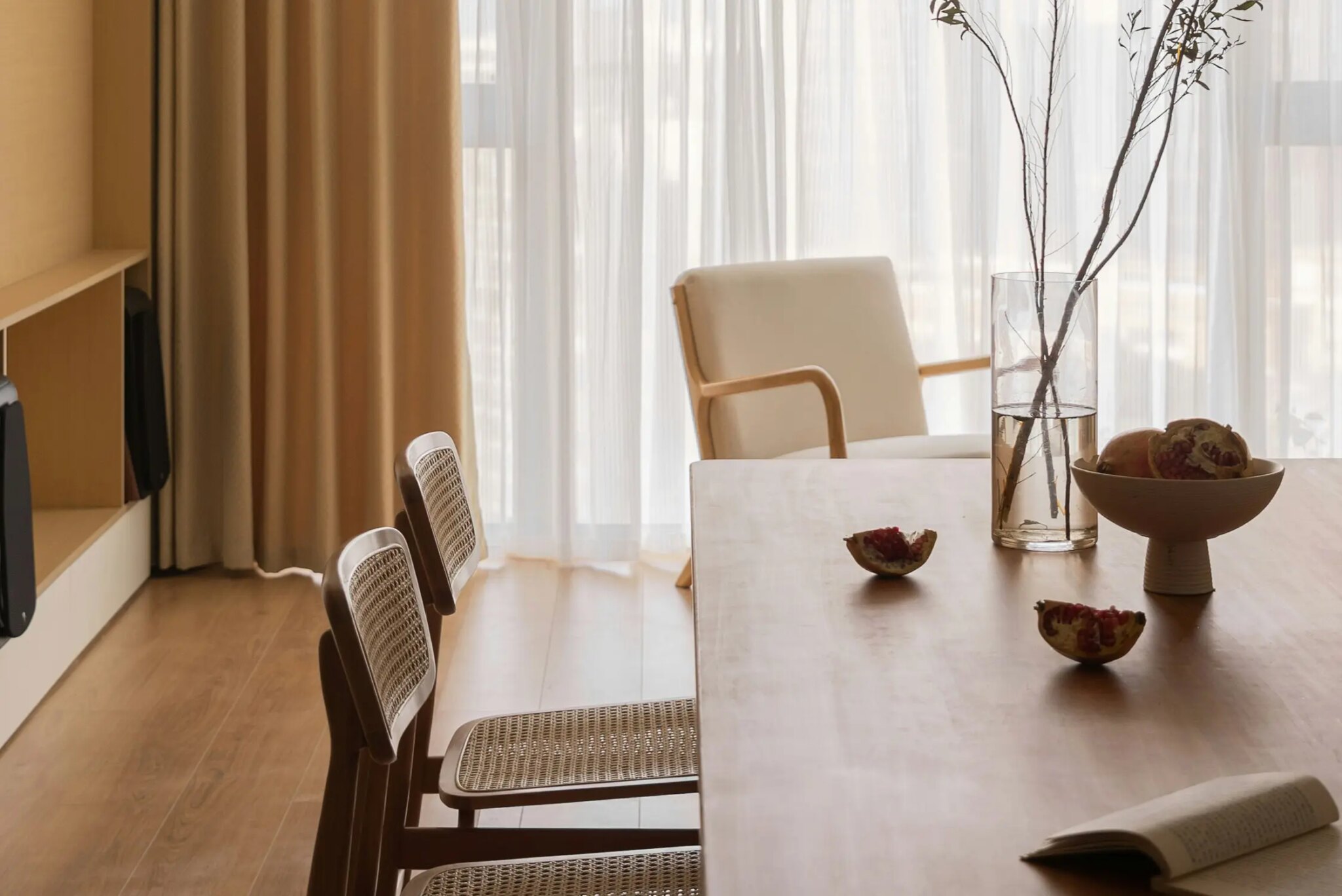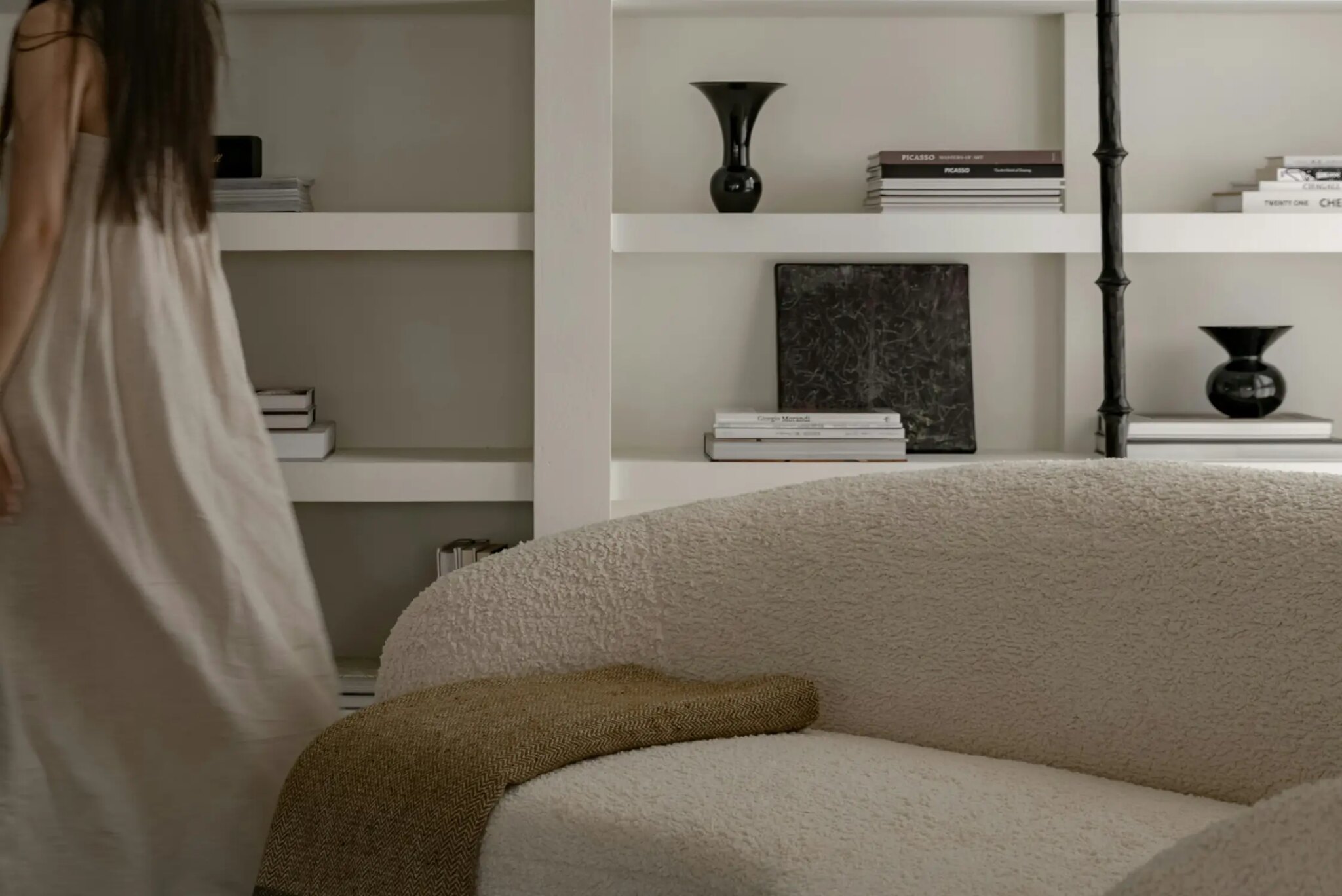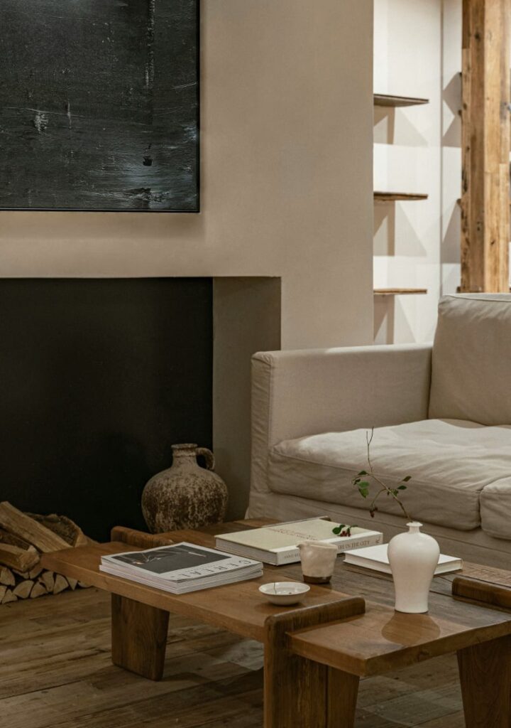 Natürliche Texturen wie Holz, Stein und gewebte Materialien, kombiniert mit satten, tiefen Blautönen, schaffen einen harmonischen Fluss, der die verschiedenen Räume im Haus nahtlos miteinander verbindet. Diese durchdachte Kombination fördert nicht nur die visuelle Kontinuität, sondern ruft auch ein Gefühl der Ruhe und des Zusammenhalts hervor, sodass sich jeder Raum wie eine bewusste Erweiterung des nächsten anfühlt.